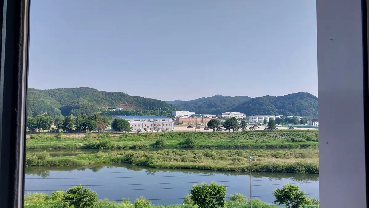 아침에 일어나서 호텔 창밖을 쳐다봤다. 저 멀리 항공부대가 보이고 헬기도 보인다. 그 앞에는 홍천강이 흐르고 시원한 뷰가 맘에 든다. 이날은 하늘도 굉장히 파랗고 구름도 하얗고 아주 날씨가 좋은 날이었다.