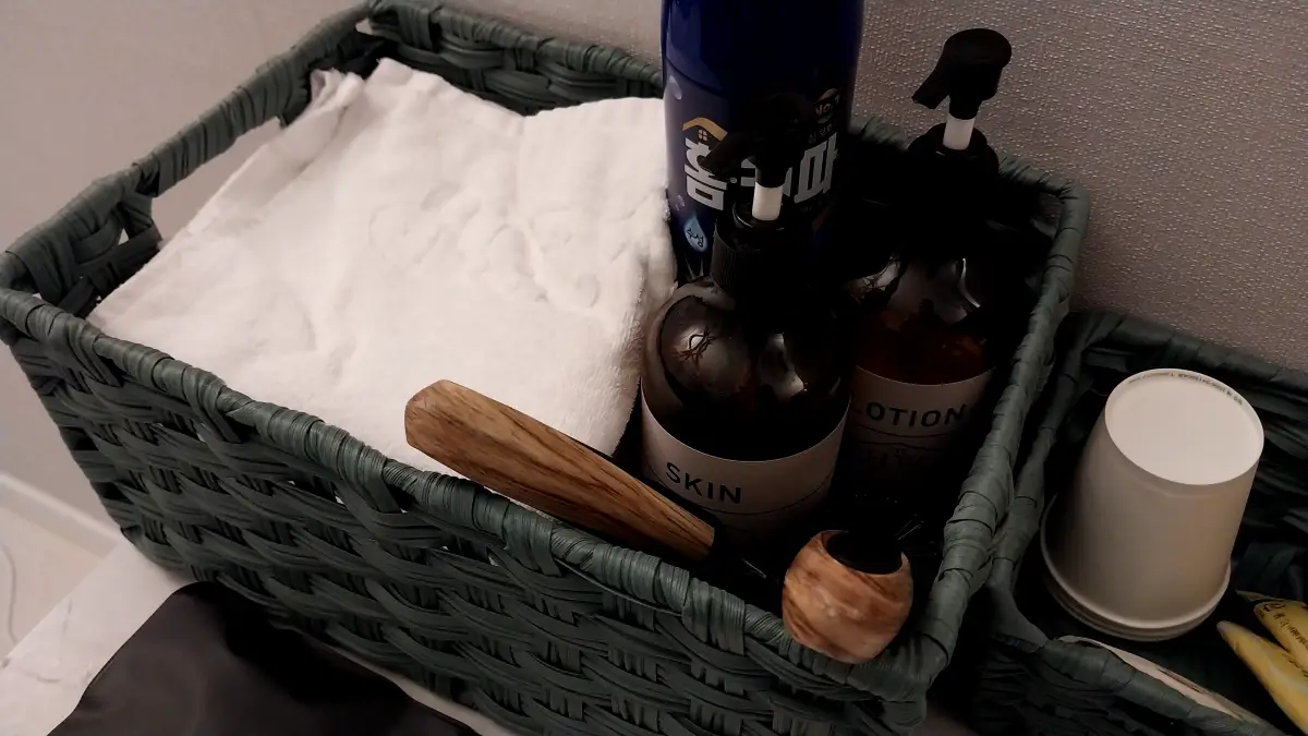 성능 좋은 드라이기도 있고 수건도 넉넉히 5장이나 된다. 그리고 스킨과 로션도 있다. 휴대폰을 충전할 수 있는 충전기도 비치되어 있어 작동도 잘된다.