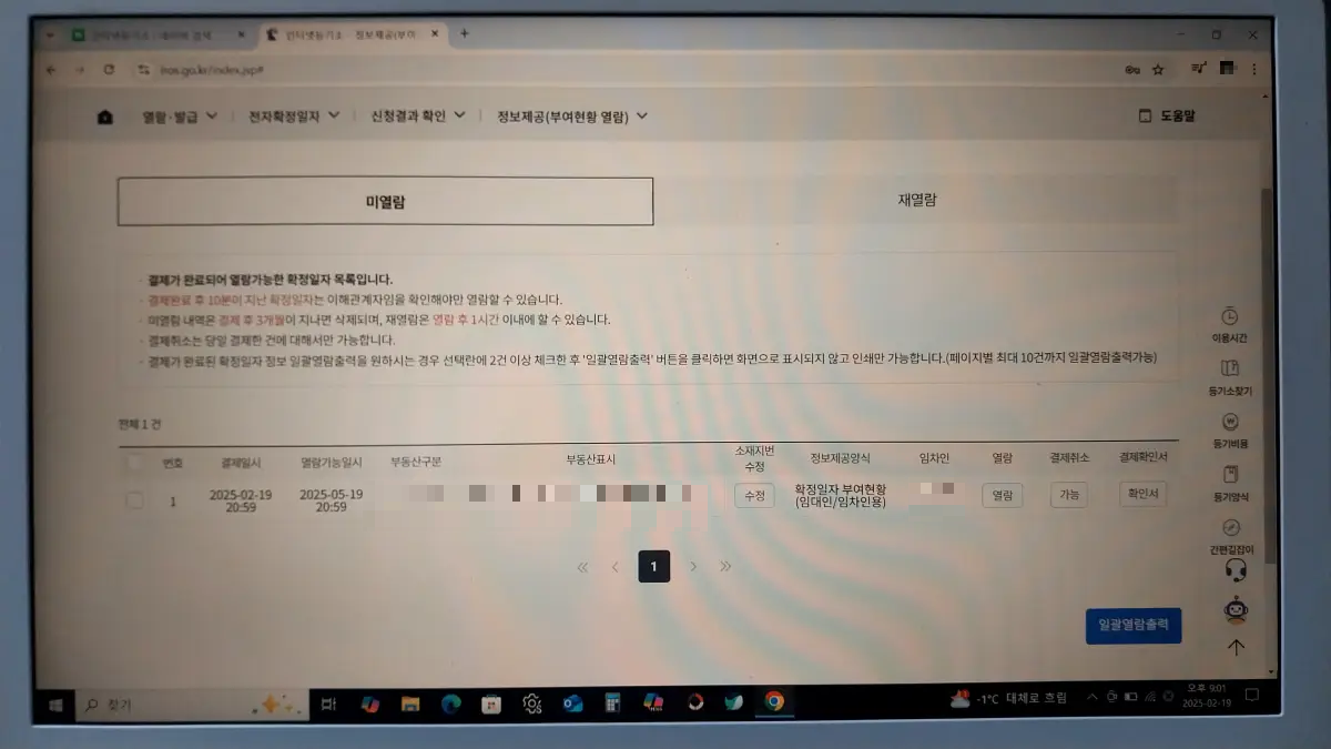 만약 나중에 열람하거나 출력하려면, 전자확정일자에 신청결과 확인에서