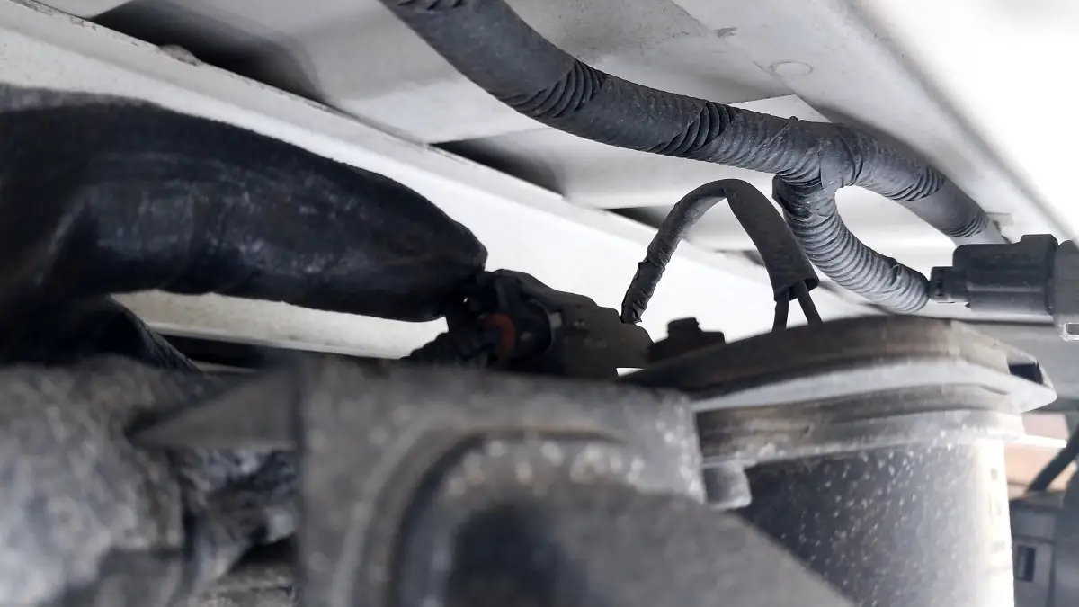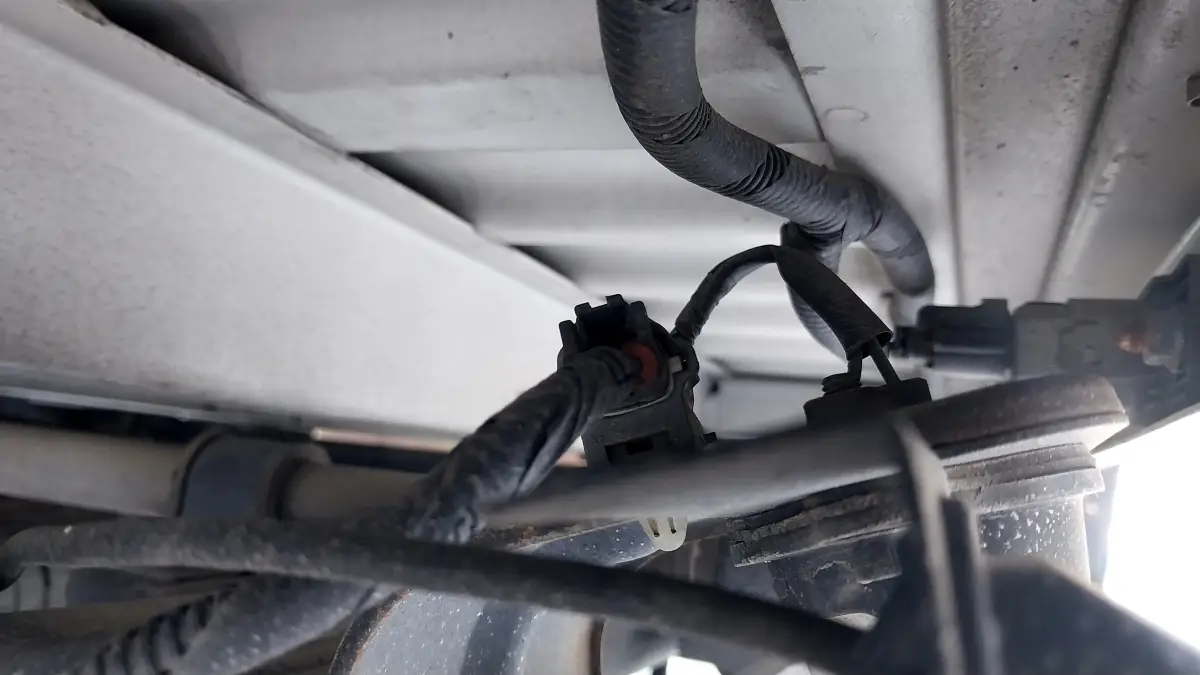 후방 적재함 하단 깊숙이 하단을 보면, 후방카메라와 충돌센서가 연결되는 배선들이 보이고 커넥터가 보인다.