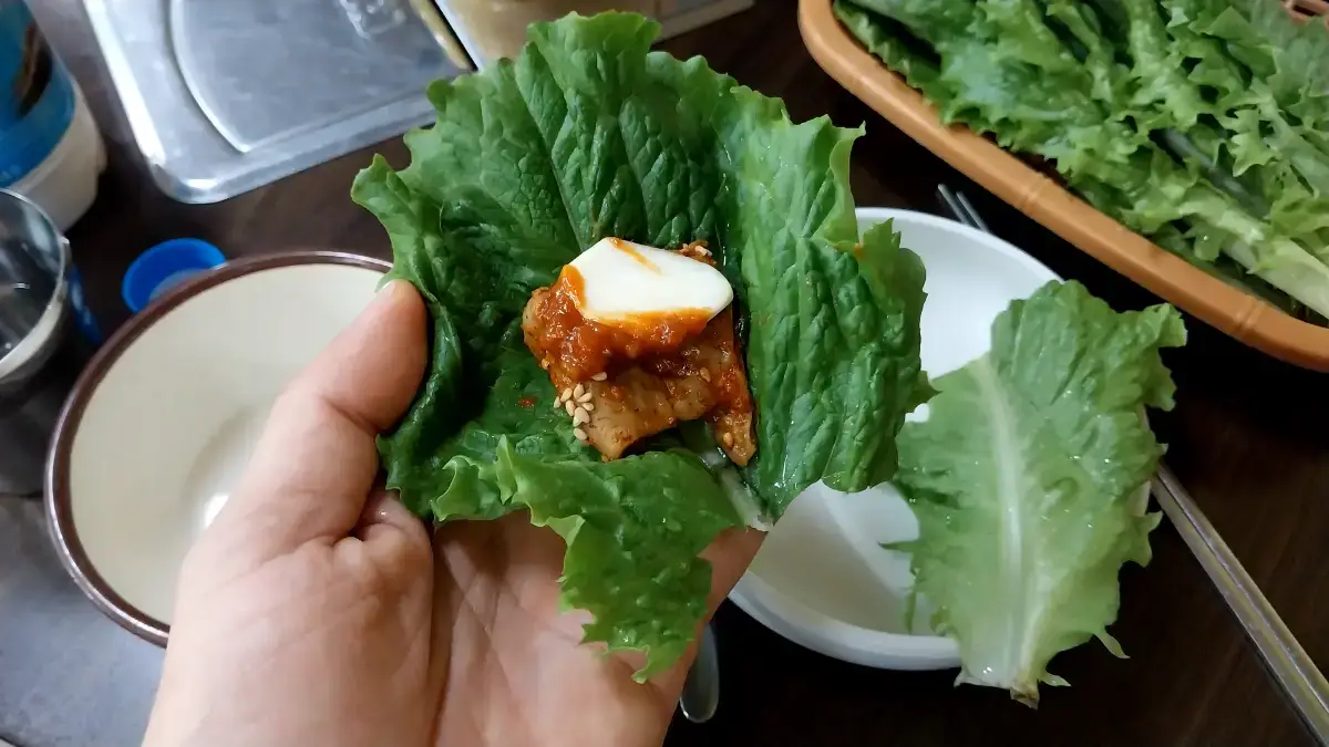 이 집 야채철판곱창을 맛있게 먹는 법은 쌈채소에 곱창 한 점을 올리고 편마늘을 하나 올려서 쌈을 싸서 먹으면 진짜 맛있게 먹을 수 있다.