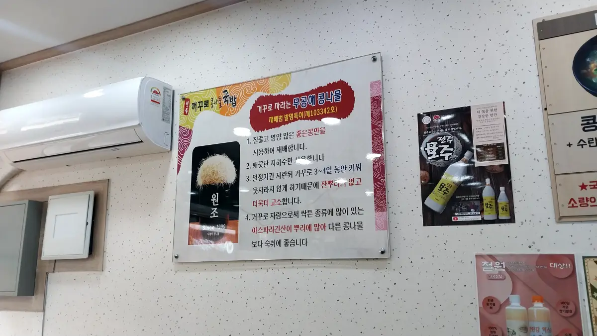 꺼꾸로 콩나물집간판과 가게입구 현재 영업중이라는 메세지가 적힌 보드가 세워져있다. 이곳은 절대 영상 촬영은 안되는 집이라고한다.