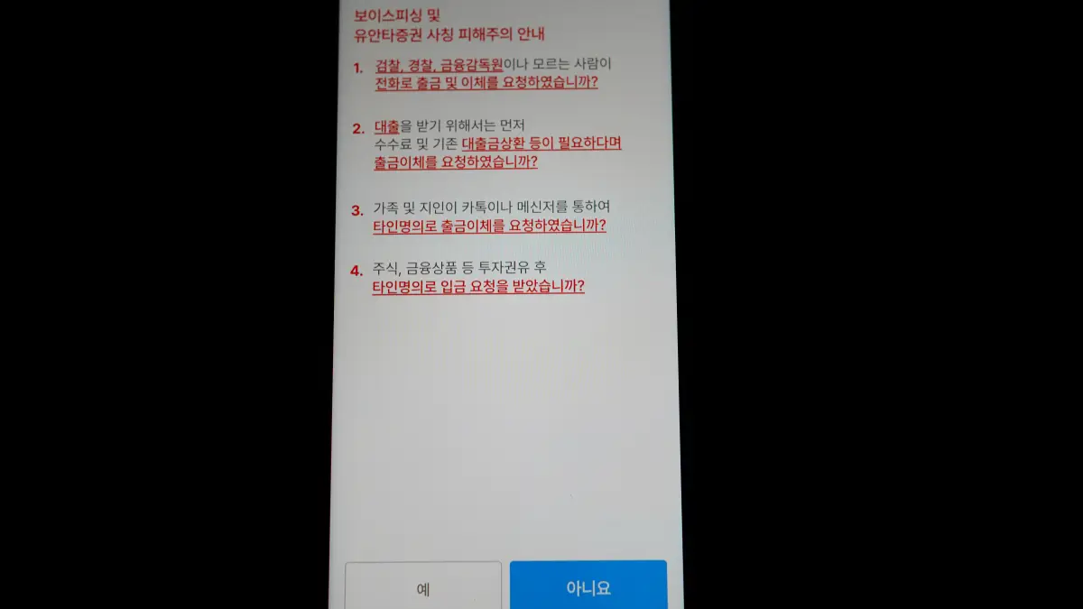 보이스피싱 주의 경고를 다시 한번 확인한다. 그리고 아니오를 누른다.